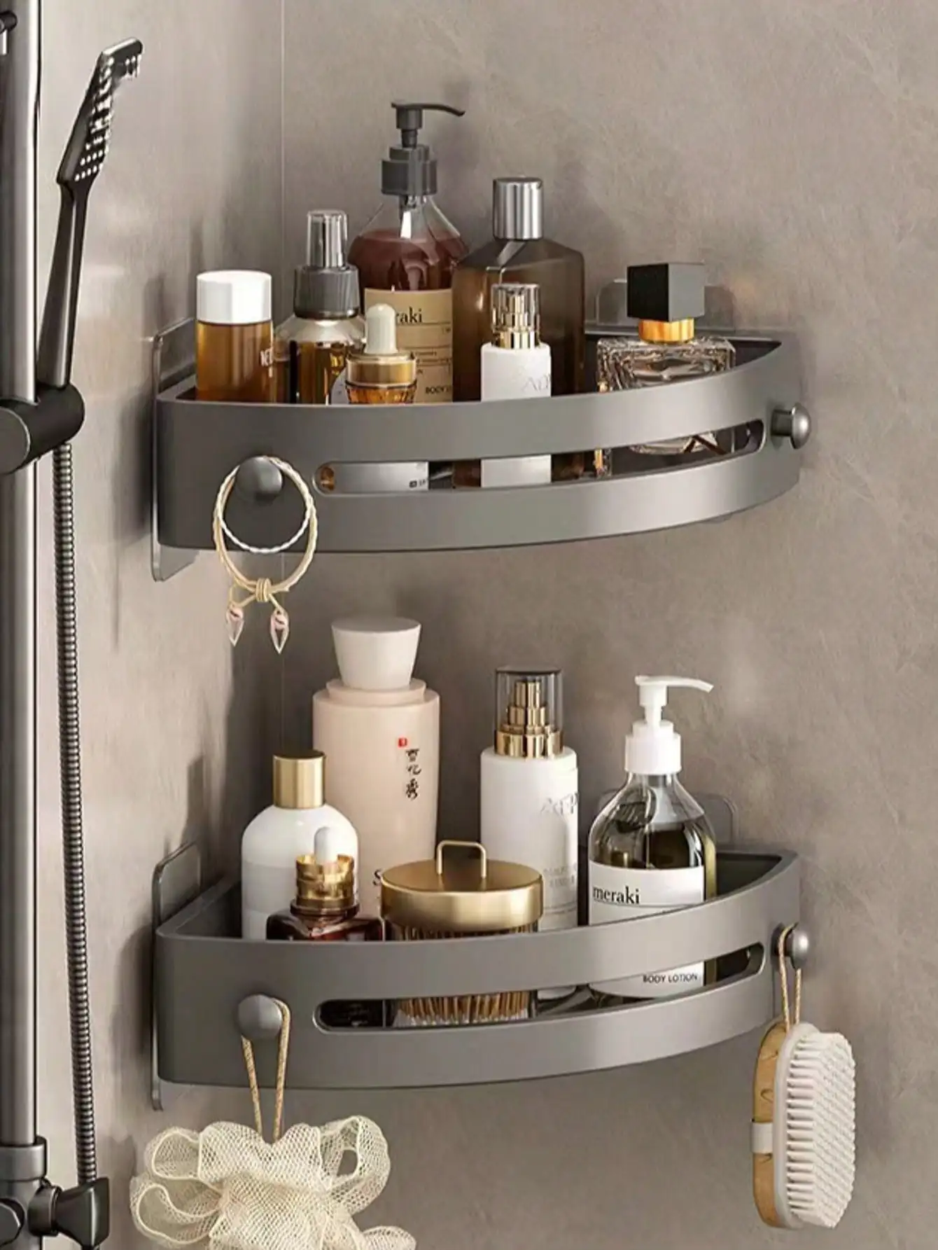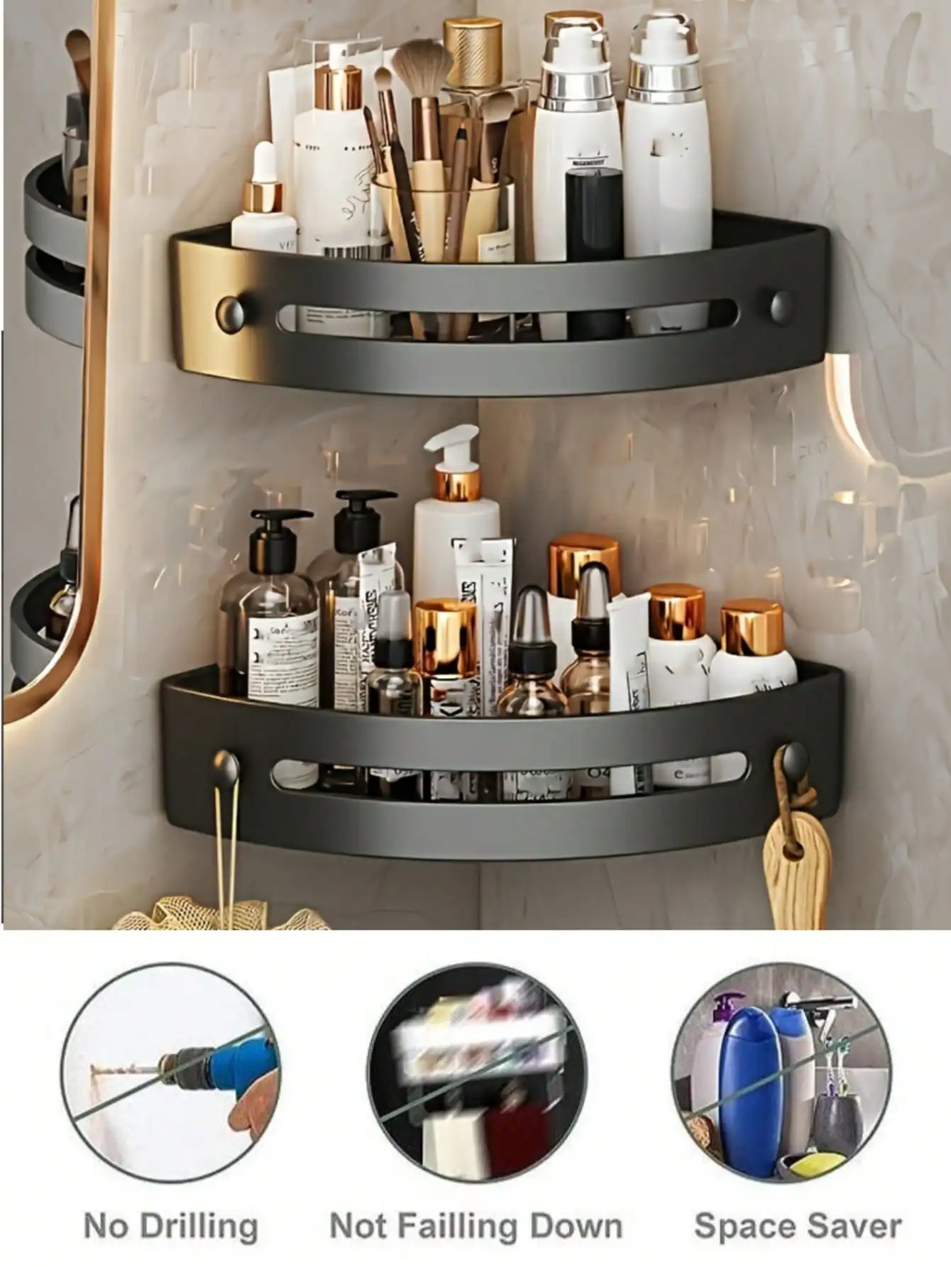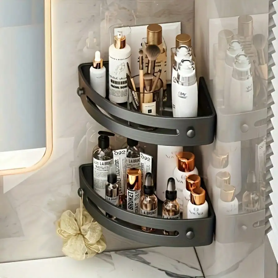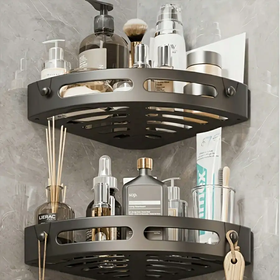 This wall-mounted corner rack is designed to maximize unused corner space in your bathroom or home.